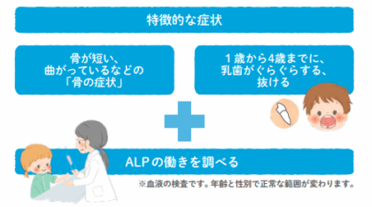 遺伝子の異常によって、アルカリホスファターゼという酵素がうまく作られなかったり、働かなくなったりすることが原因です。